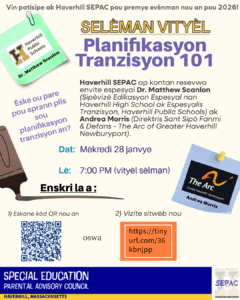 Haverhill SEPAC is thrilled to host guest speakers Dr. Matthew Scanlon (Haverhill Public Schools, Special Education Supervisor – Haverhill High School, and Transition Specialist) and Andrea Morris (Director of Family Support Center & Advocacy – The Arc of Greater Haverhill Newburyport).