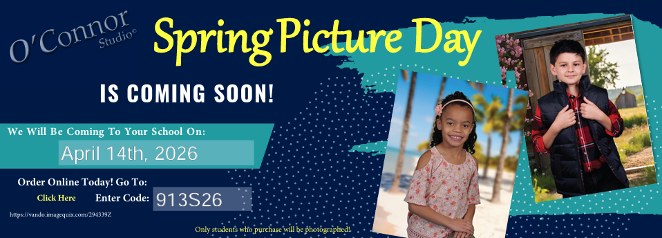 Hello parents/guardians,We have our Spring Picture Day coming up on Tuesday April 14th. Click the link below if you wish to purchase your students pictures. Forms will be sent home today Thursday A...